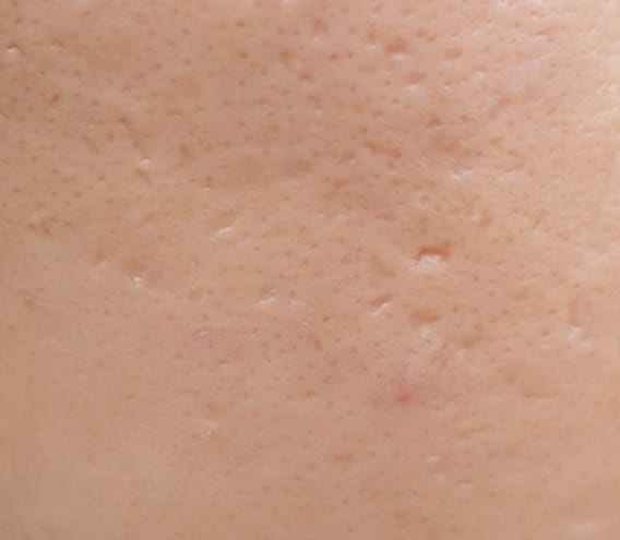 경계가 분명하게 남아 피부 표면이 고르지 않게 보이는 함몰 흉터입니다.